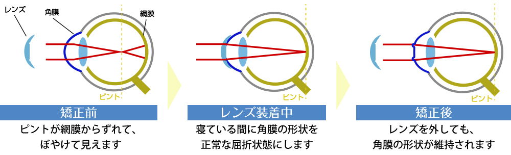 就寝時にレンズを装用することで、角膜の形状が変化し視力が回復します。